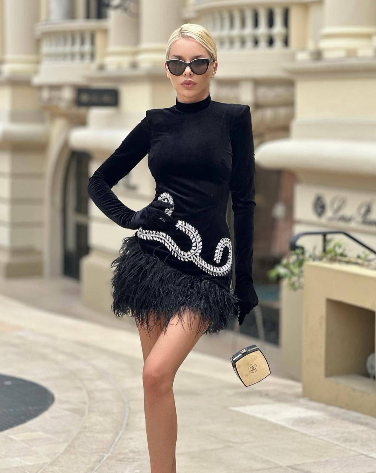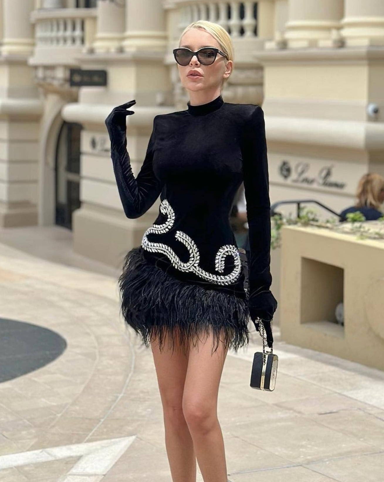 The Milena Mini Dress is a chic take on a timeless classic. Crafted with luxurious black fabric, this dress features full sleeves with built-in gloves, padded shoulders and rhinestone detail for a glamorous finish. Feathers cascade romantically from the hemline, adding a delicate touch to this sophisticated piece. Perfect for a night of elegance.