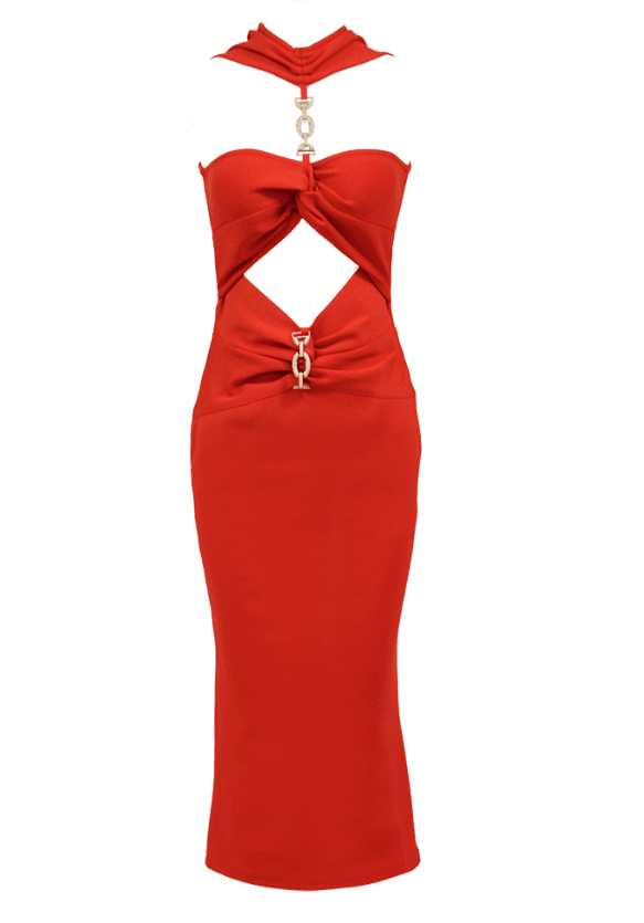 Elegantly crafted, the Miyah Midi Dress in deep red exudes sophistication. The halter neck design and waist cutout create a sleek silhouette, while the gold chain detail adds a touch of luxury. Perfect for any formal occasion, this dress is a must-have for the modern, stylish woman.