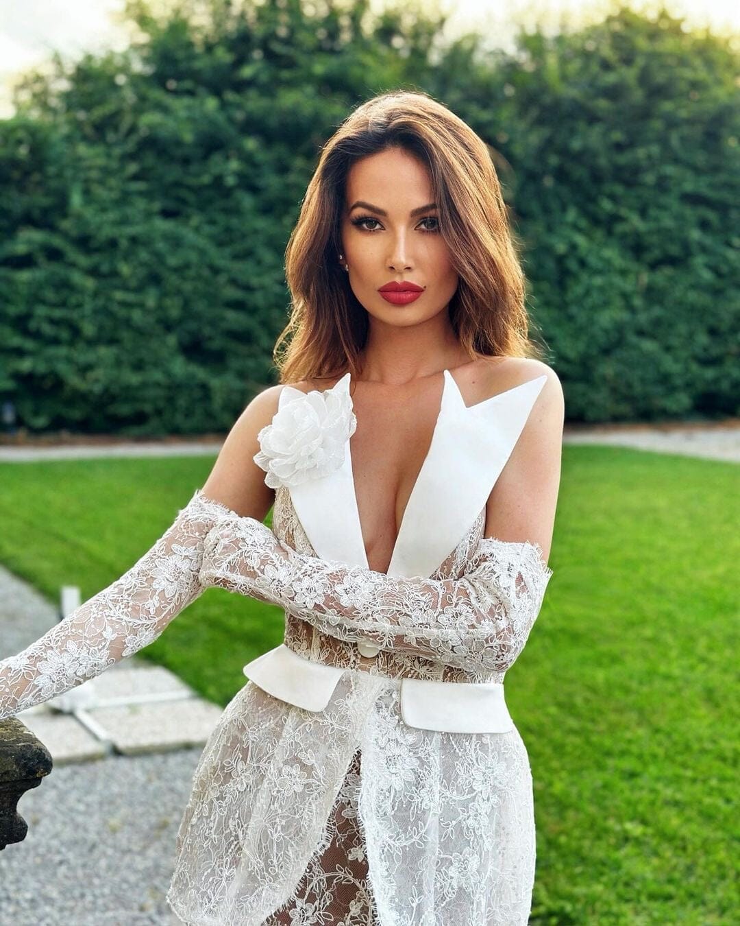 Indulge in luxury with the Murielle Maxi Dress. This exquisite white lace dress features a flattering corset top and delicate see-through lace, paired with matching gloves for a truly elegant touch. Elevate your style with this statement piece.