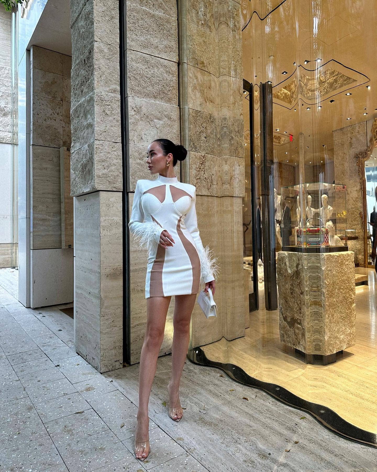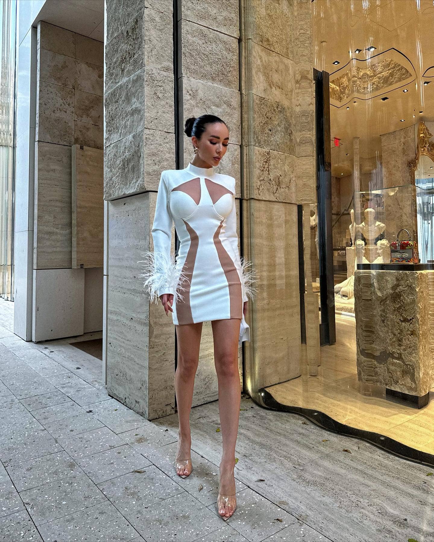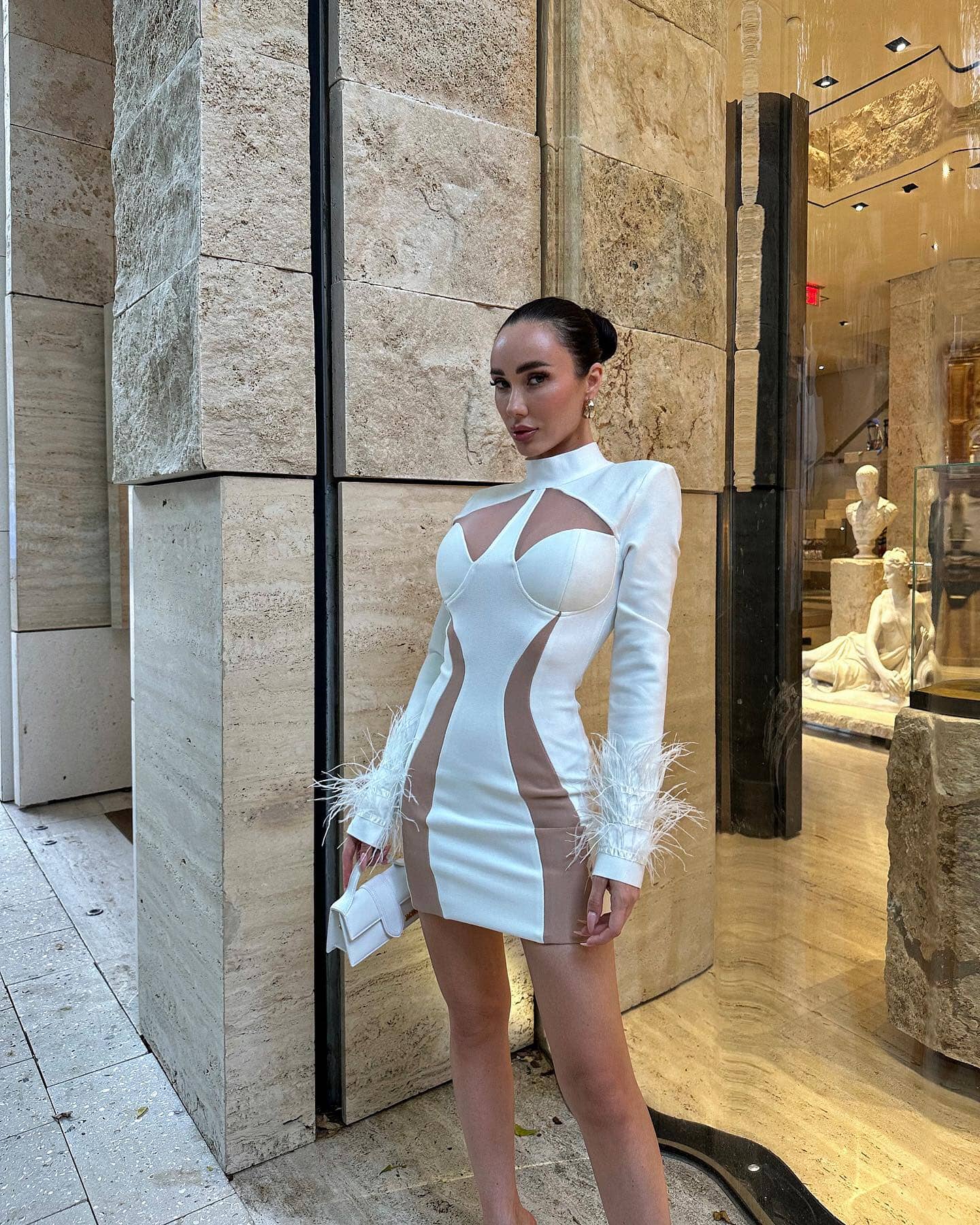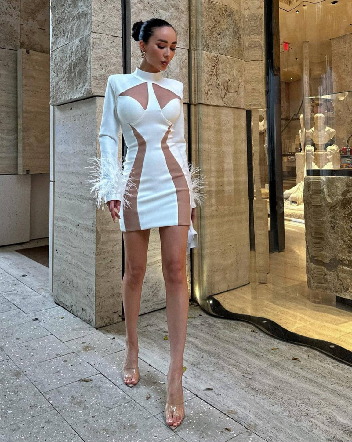 The Nancee Mini Dress is an elegant expression of femininity. With its high neckline, billowing feather sleeves and delicate mesh detail, this dress will elevate your look with its luxurious air of sophistication. Let yourself be wrapped in elegance with this timeless mini dress.