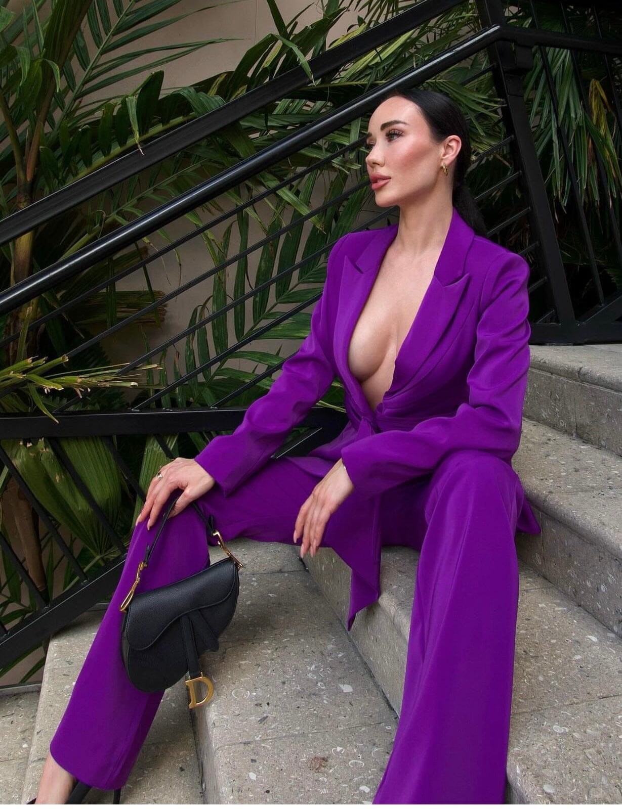 Indulge in sophisticated luxury with the Neisy Two Piece Set. This stunning ensemble features a regal purple blazer paired with a cinched belt for a flattering silhouette, and matching pants for a complete, polished look. Elevate your wardrobe with this exclusive set that exudes elegance and refinement.