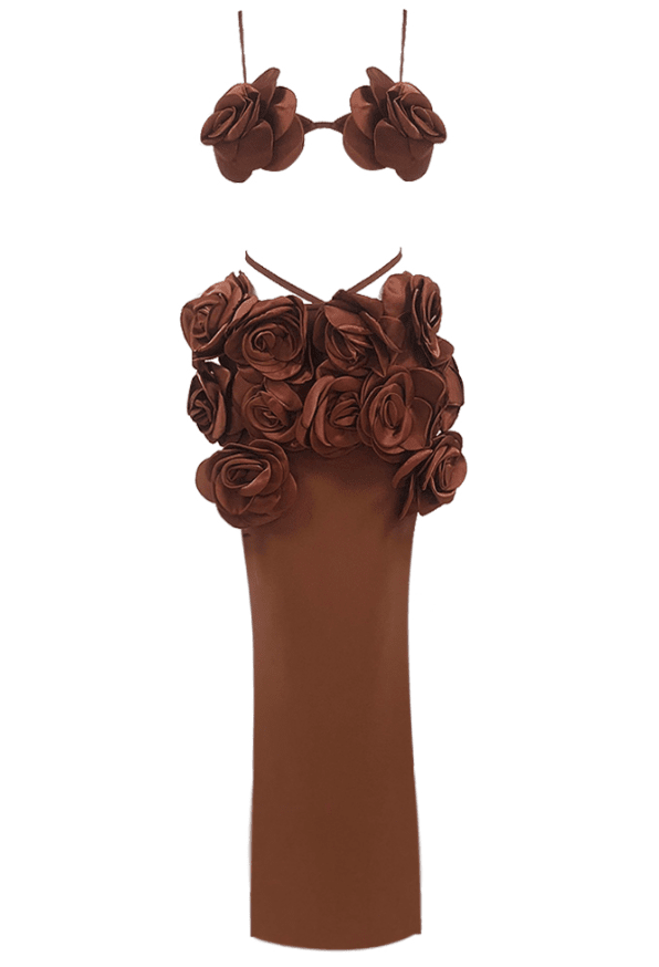 Indulge in the beauty of nature with our Nica Two Piece Set. This luxurious brown set includes a stunning flower bralette and a matching maxi skirt with delicate flower detailing. Perfect for any occasion, this set will make you feel elegant and exclusive.