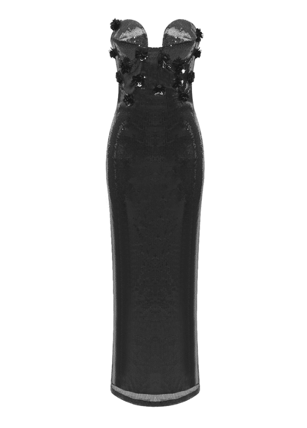 Created to make a memorable entrance, the Nisha Maxi Dress is the perfect choice for any special occasion. This elegant dress is crafted from a soft black sequin fabric, with an eye-catching bustier top and exquisite mini flowers for an extra touch of sophistication. Feel beautiful, confident, and special with the Nisha Maxi Dress.