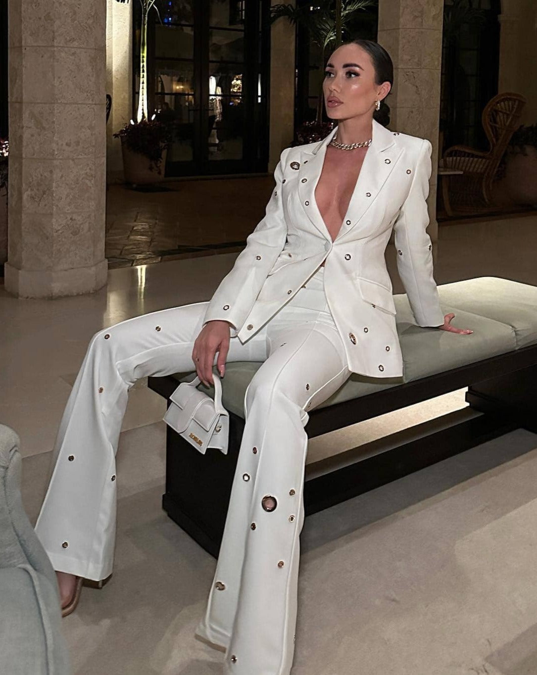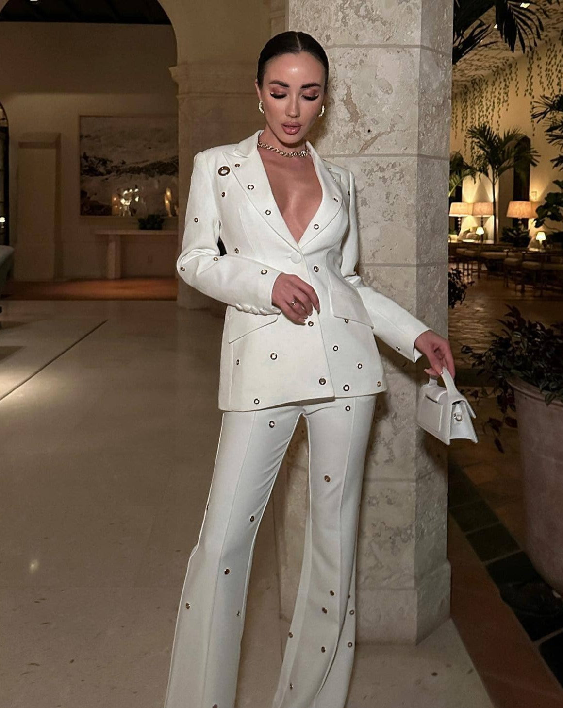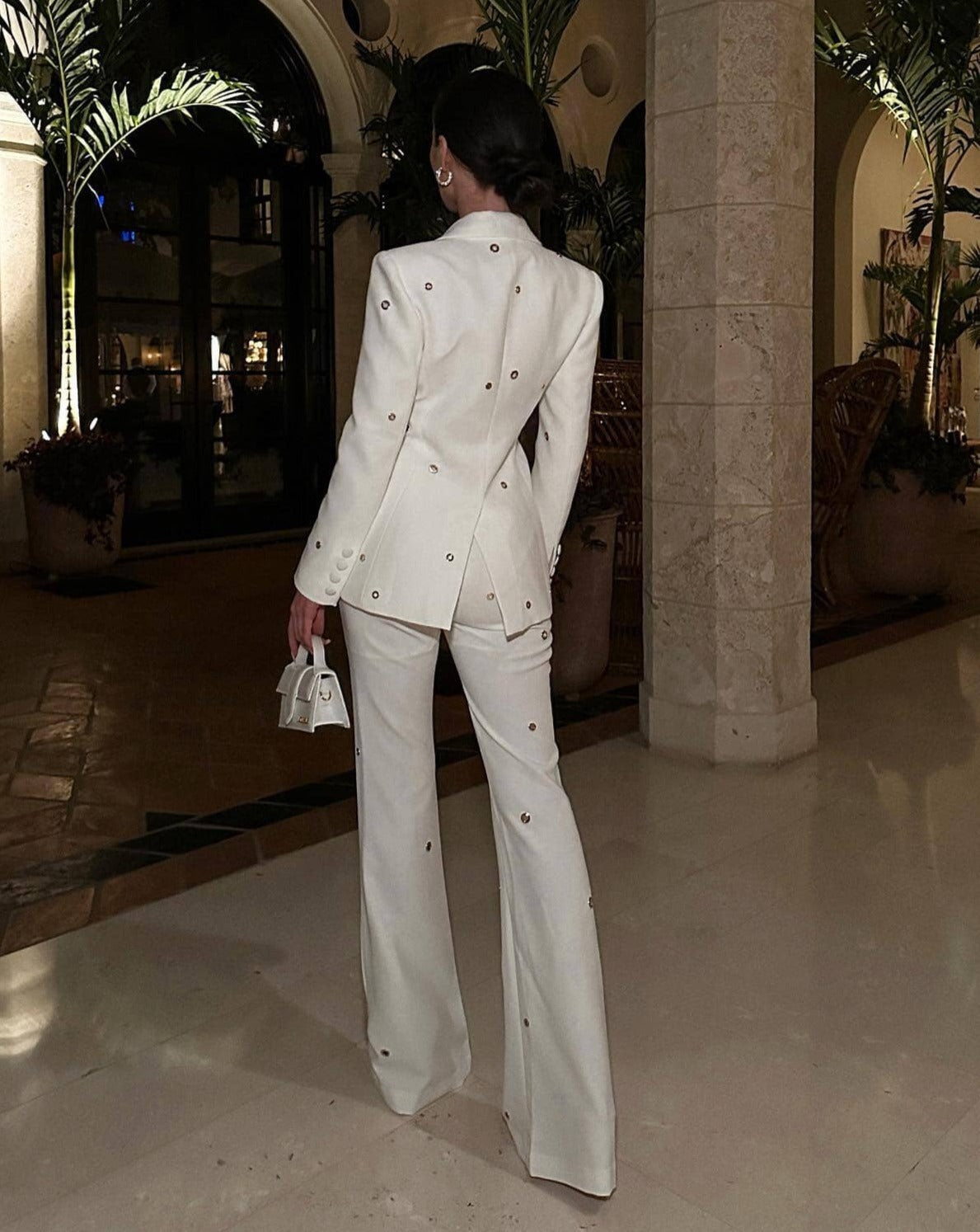 Add another boss girl look to your closet with our Oana Two Piece Set! Featuring tailored pants and a double breasted blazer with gold detailing in a white colour. Style with heels for a look we're loving!