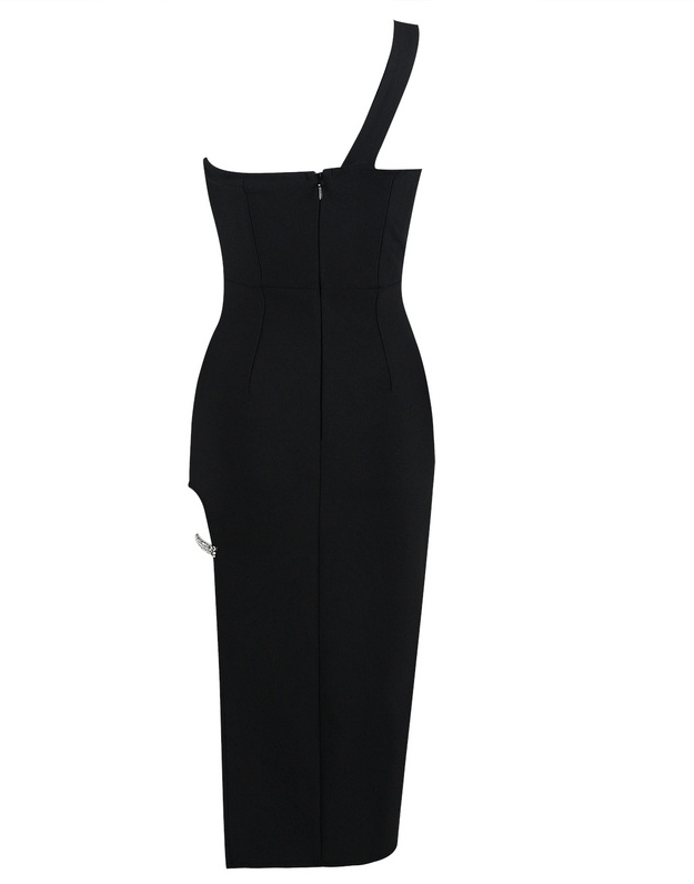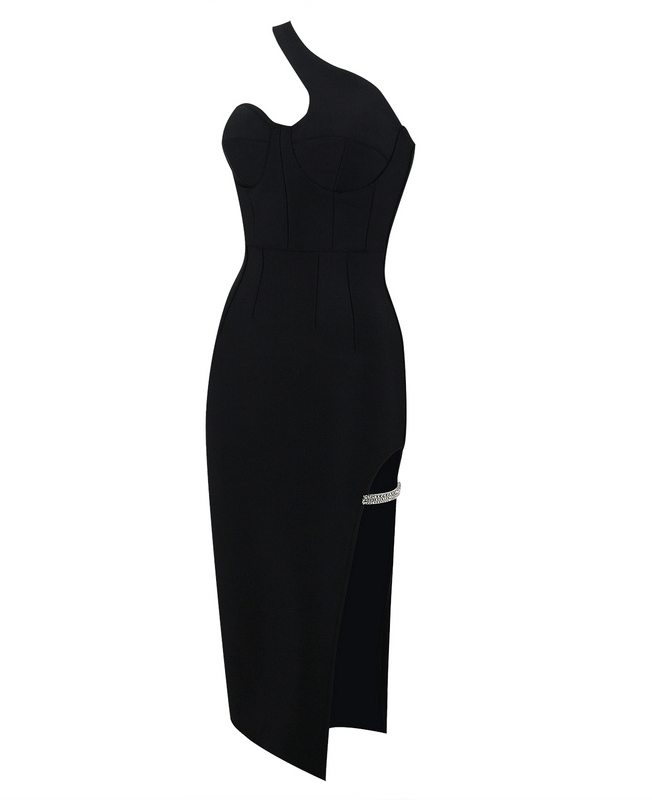 Our Olena Dress has a single sleeve and an open leg in a romantic full-length design. is constructed from bandage fabric with rhinestone detail on the leg. Style with heels for a chic look!