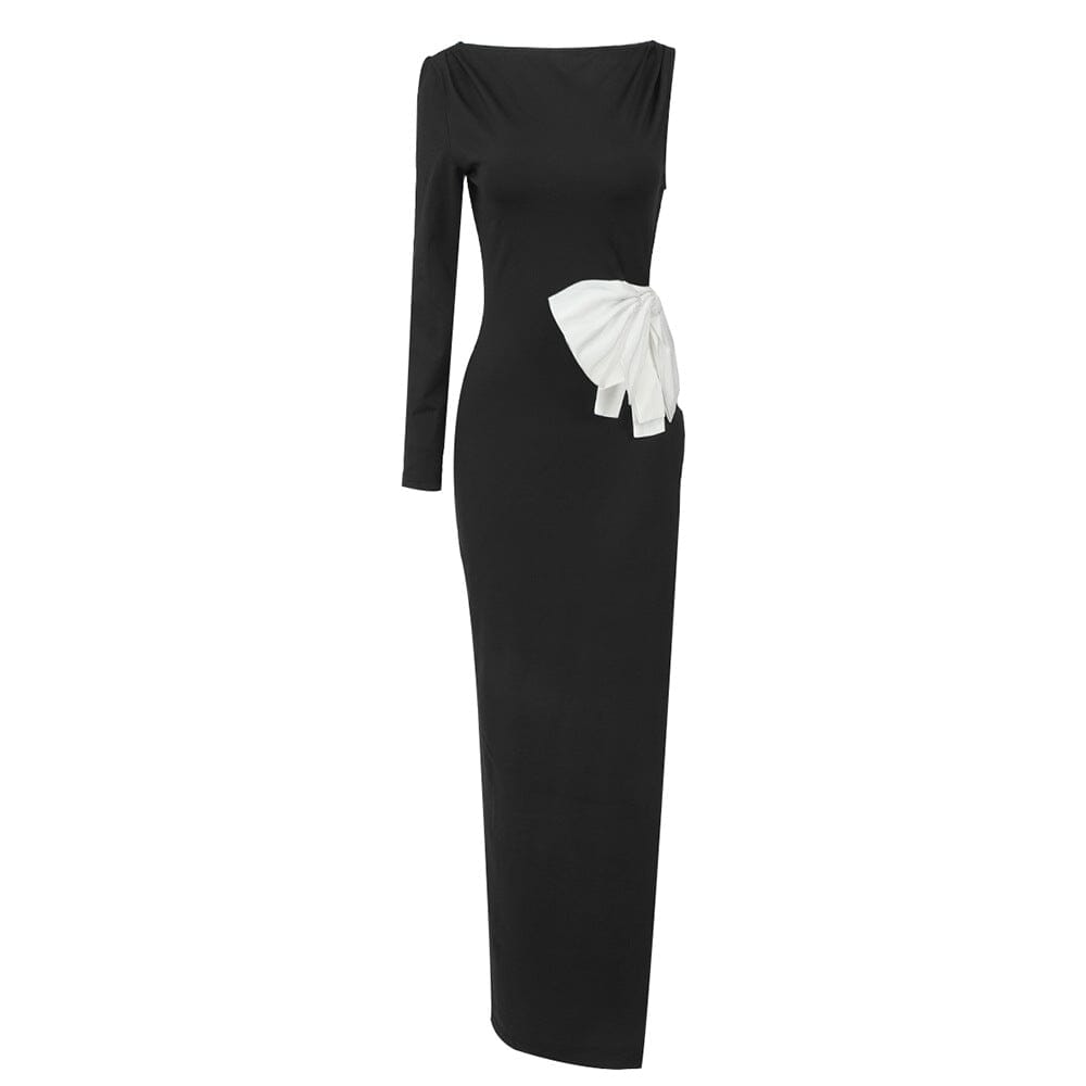 The Rasha Maxi Dress is a statement piece crafted for luxury and sophistication. An all-black silhouette is adorned with a striking oversized white bow, and a daring open back reveals just the right amount of skin, allowing you to embrace elegance with an air of mystery. Perfect for any black-tie affair.