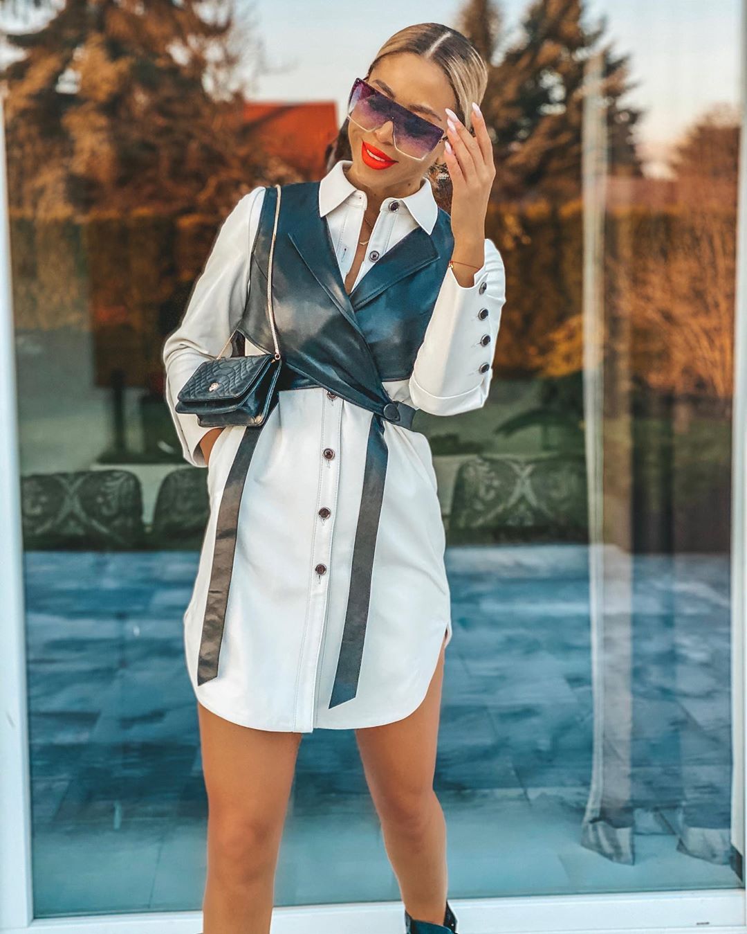 We are obsessing over our Rebecca leather shirt and vest! Featuring a structured white leather shirt with black buttons and a black leather vest for an edgy look! This versatile style can be worn without the vest. The black vest can also be styled separately. Style with boots or heels for a sexy look!