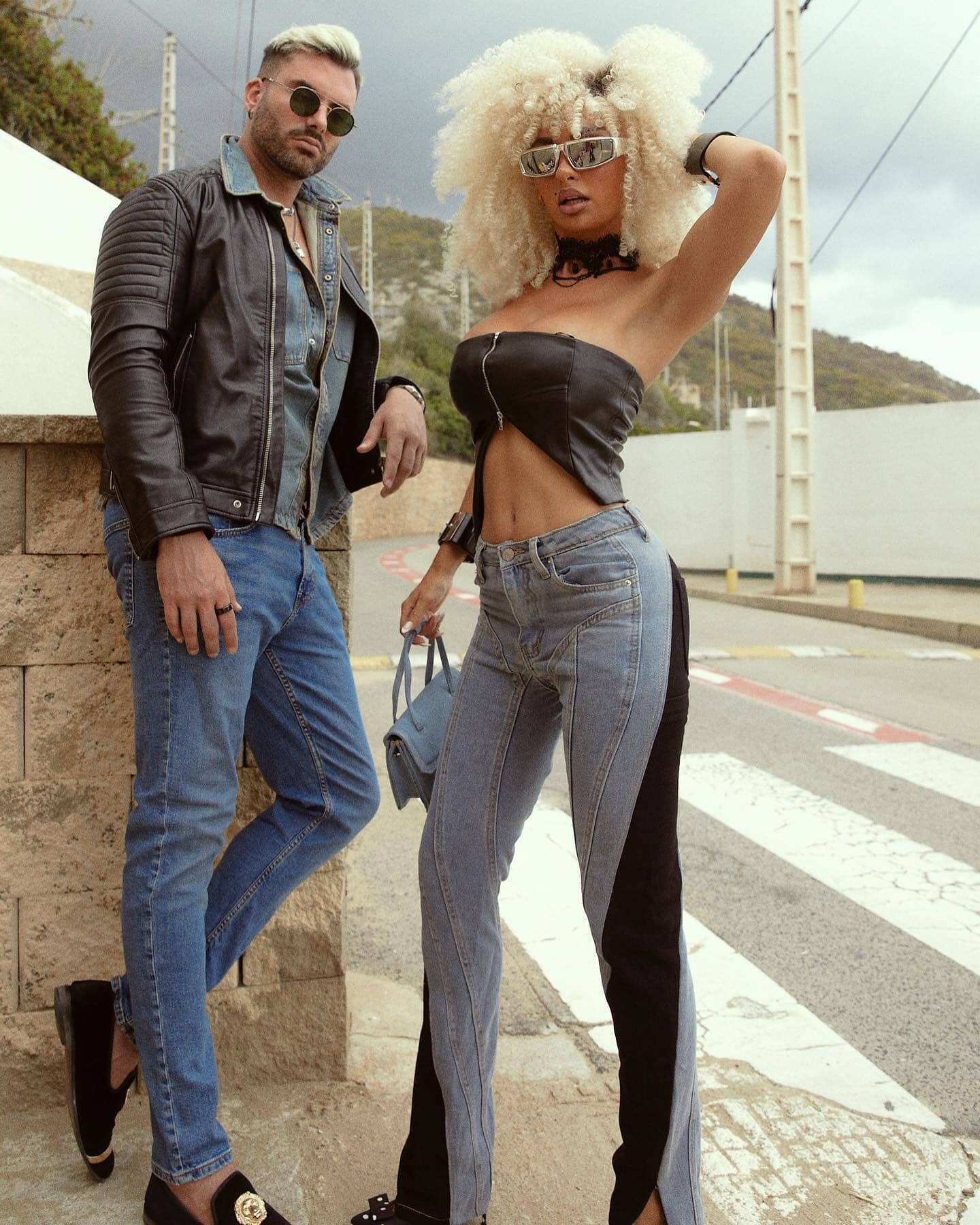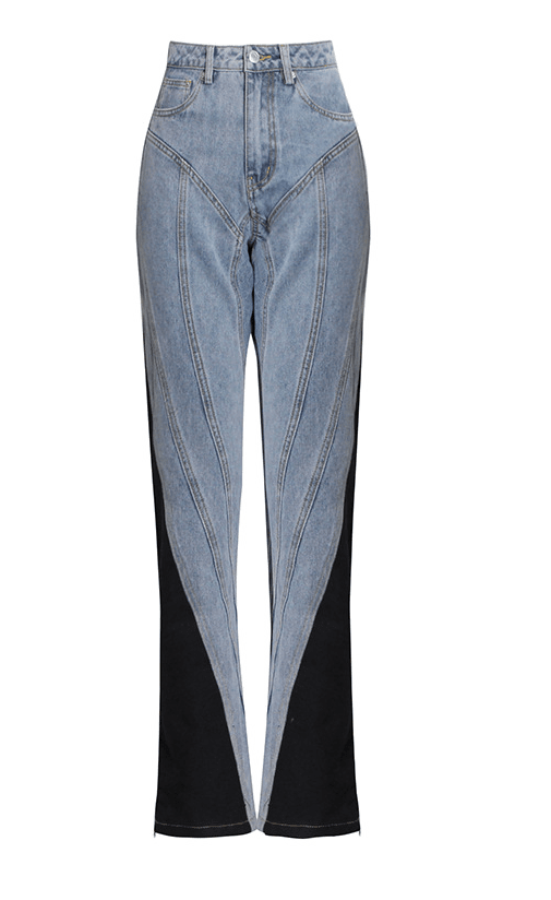 Experience the intricate craftsmanship of Salome Jeans, a premium two-tone denim with a flattering high-waist silhouette. The delicate blend of black and blue in the fabric creates a unique visual contrast, making them the perfect statement piece for any bold wardrobe.