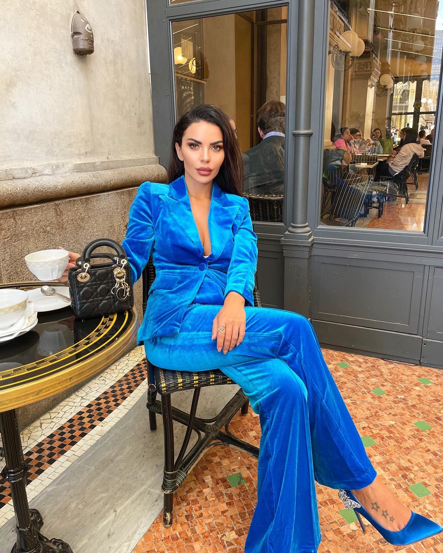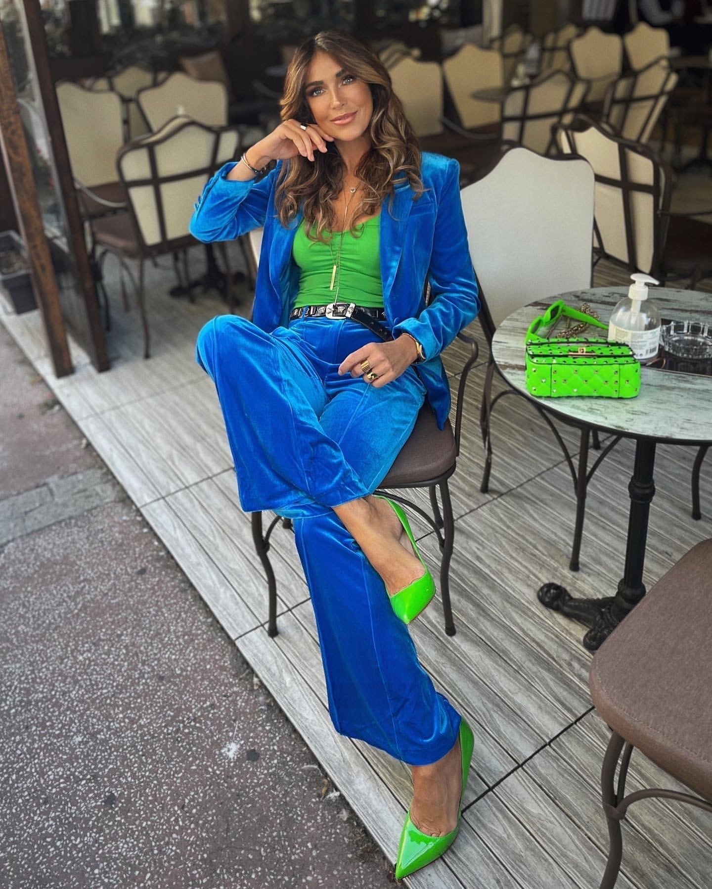 The sashauna set is a velvet, slim fit style featuring a velvet fabric. Style with your favorite accessories for a chic look.