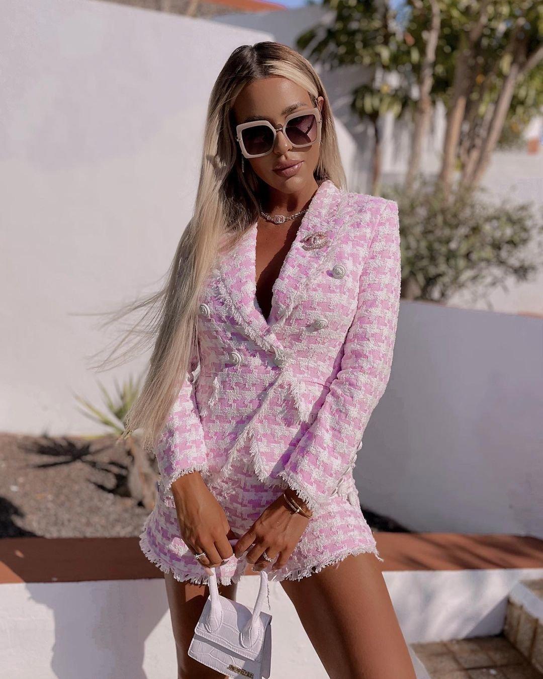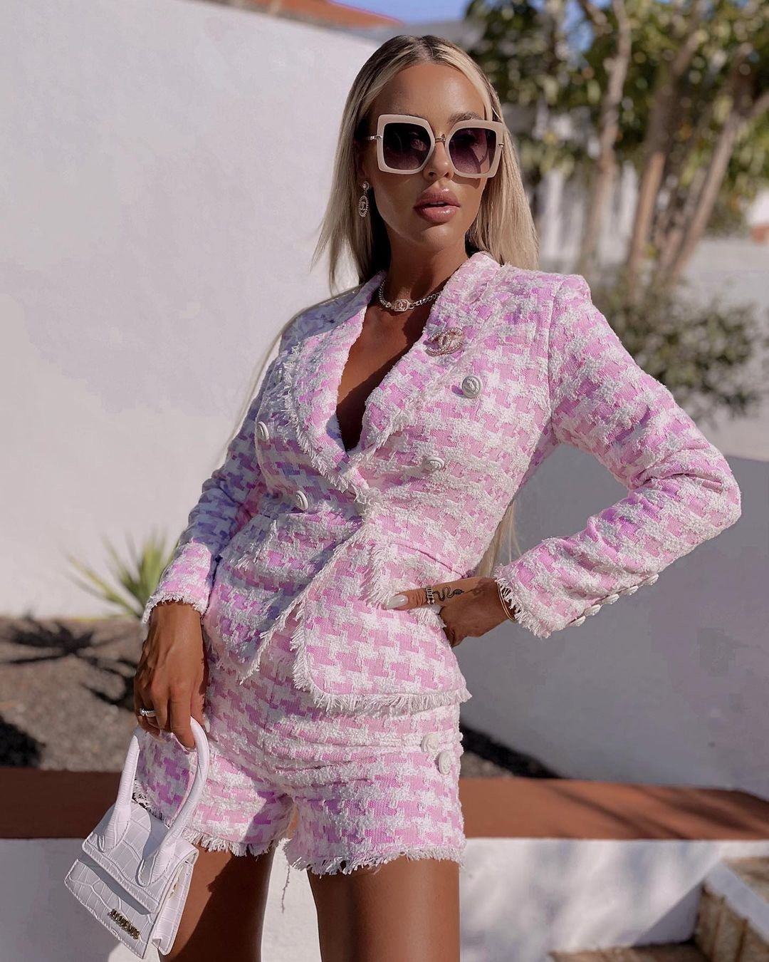The Shalia two piece set is one of our new arrivals! This elegant and stylish two piece set is perfect for any occasion. It features a fitted blazer with matching shorts and can be worn buttoned up or layered with a top for a casual look.
