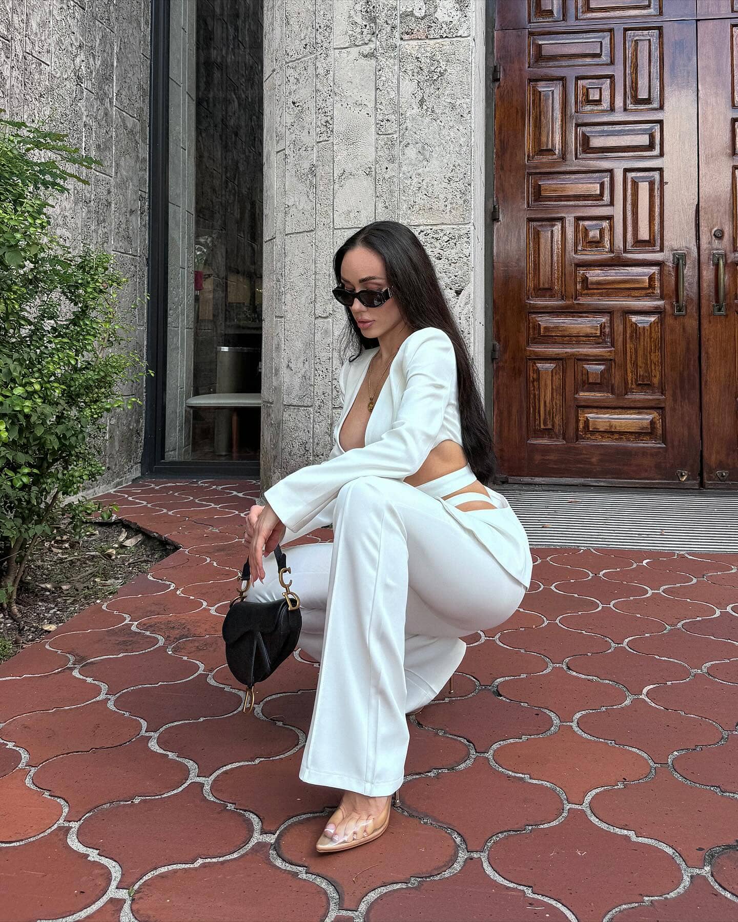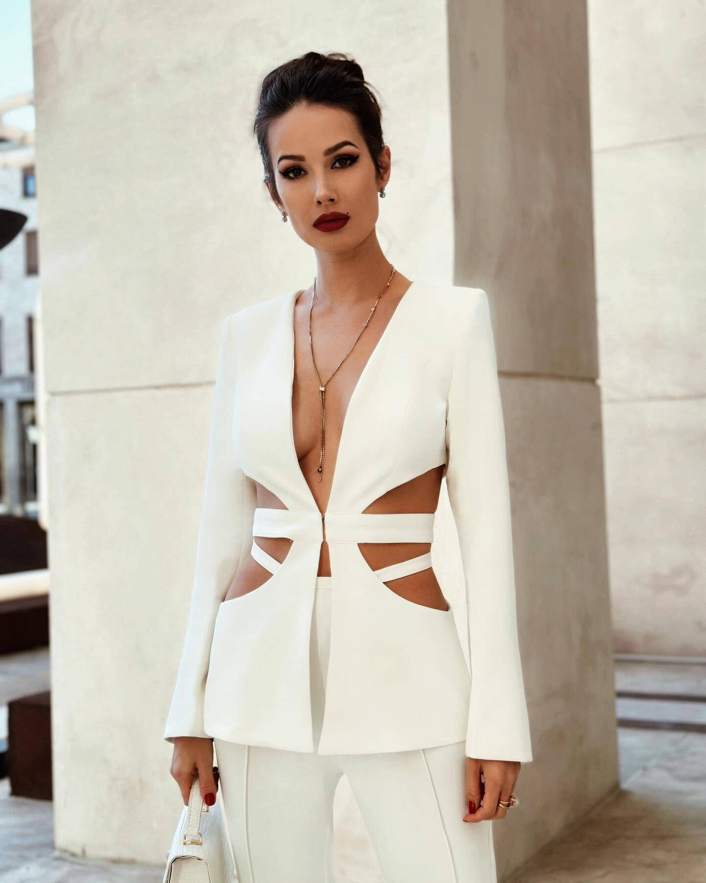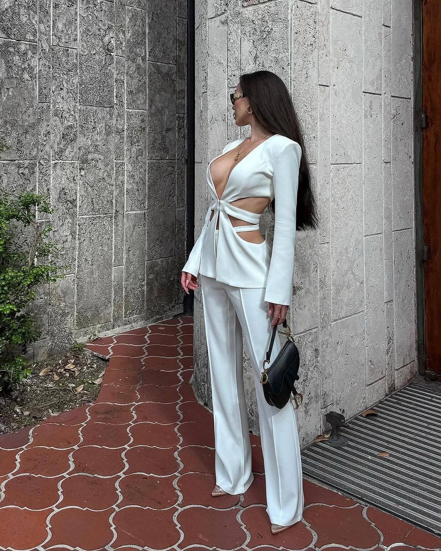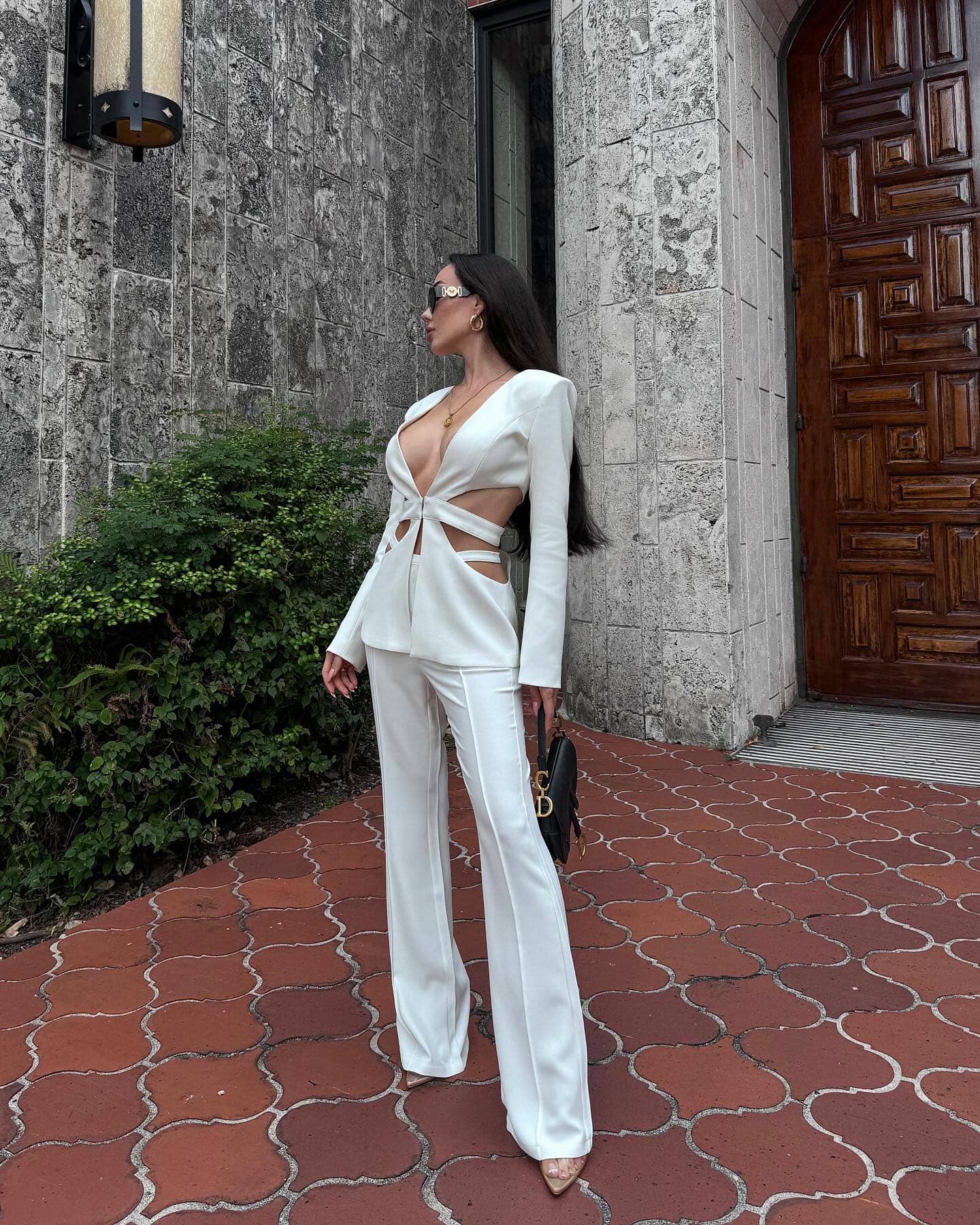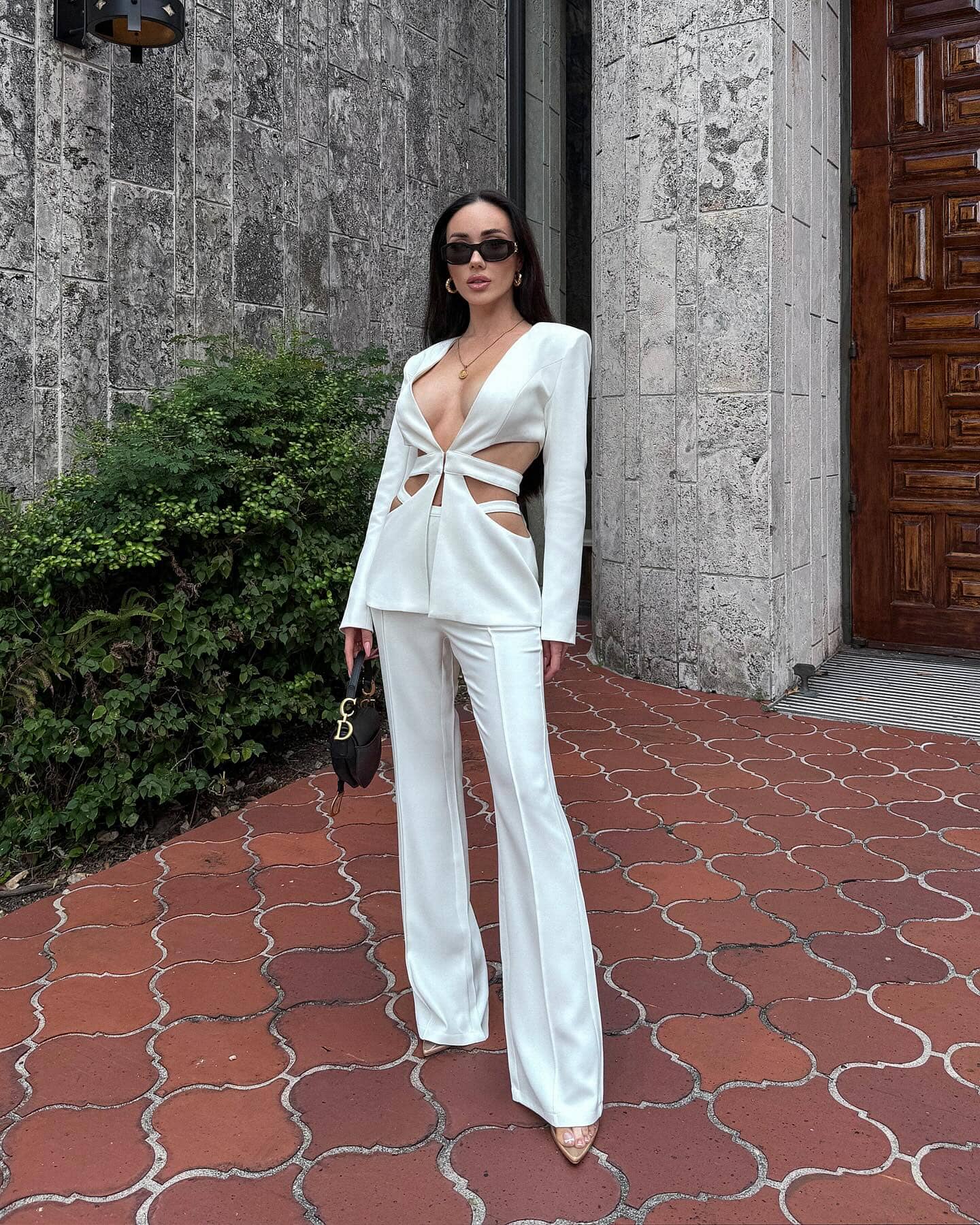 Good things come in twos. Set featuring blazer with waist cutouts, paired with matching flared leg pants with cut out detail at the hips. Wear it with a pointed-toe heels for your next special occasion.