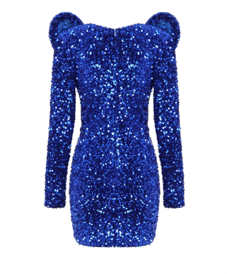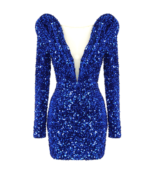 Our dramatic Shedon dress is made from sequin lace. It features a plunging neckline and with full sleeves. Style with strappy heels for the perfect party look!