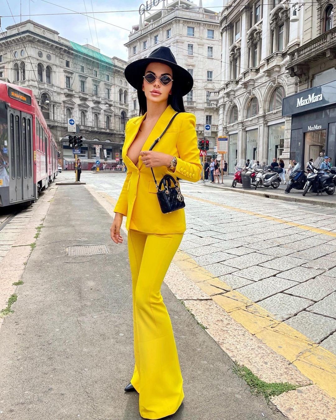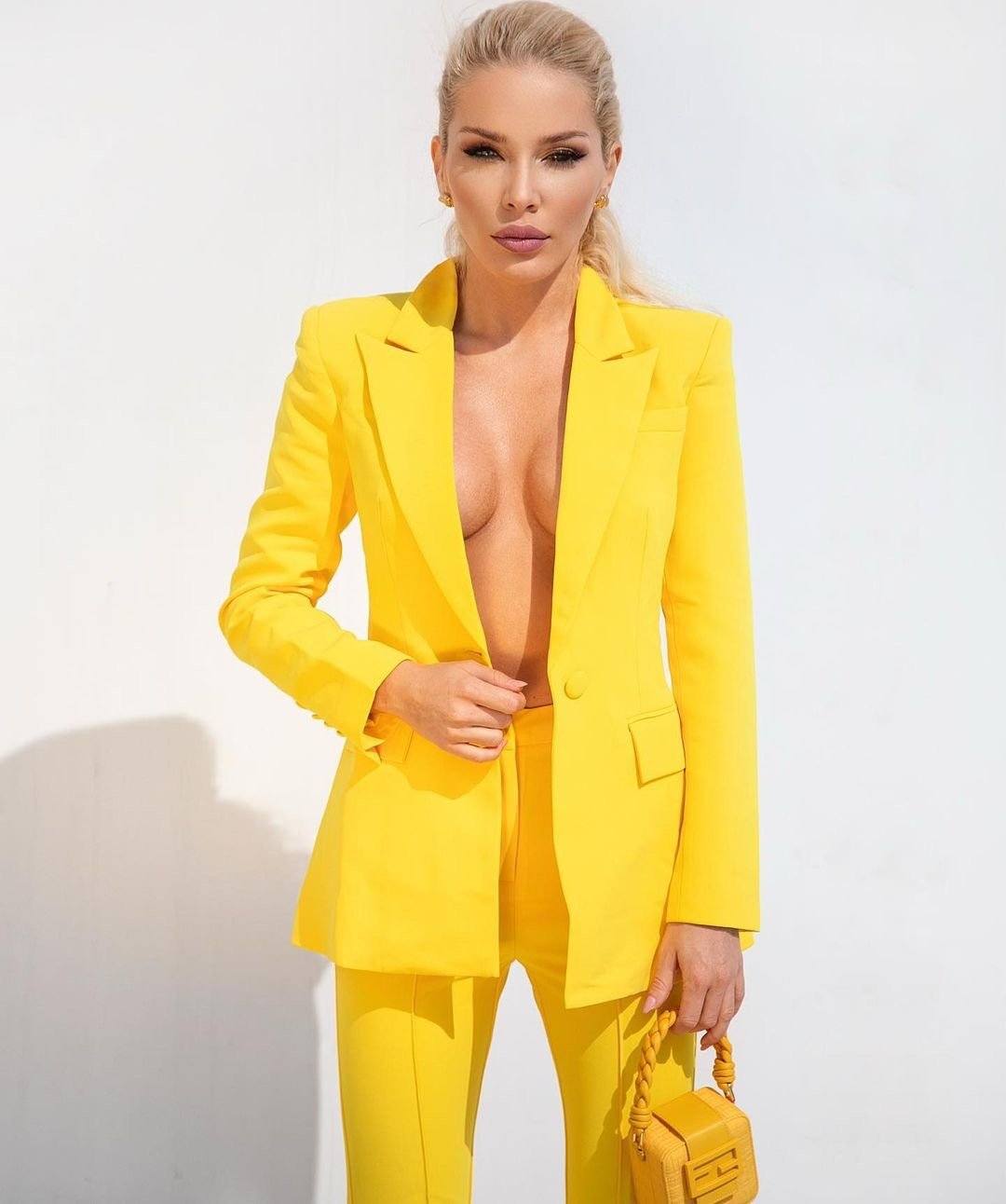 Get that boss girl look with our yellow Shirley two piece! Featuring a classic blazer with flap pockets and a single button closure design. Paired with tailored ultra flattering high waist flared pants. Wear it with a pointed-toe pump for your next special occasion.