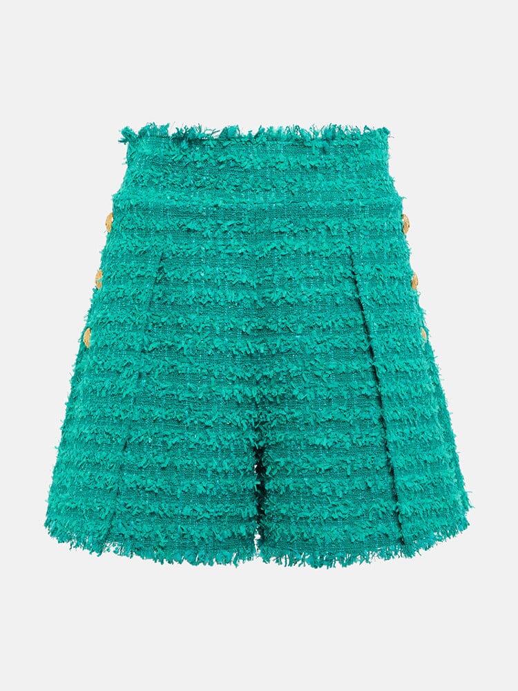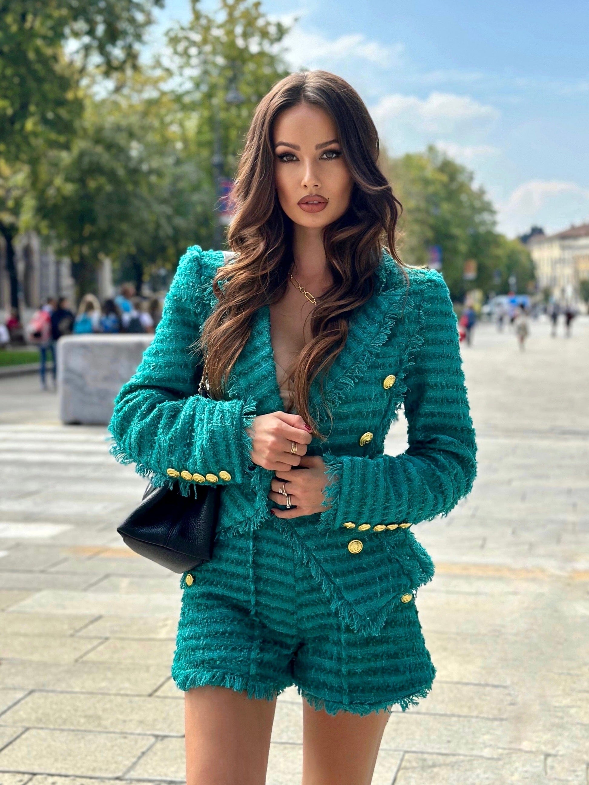 Stand out in style this season with the Siran Two Piece Set. Crafted from luxurious green tweed with timeless gold buttons, this set is a sophisticated choice for any event. Perfectly tailored for a structured fit, the blazer and matching shorts create a look of effortless elegance. Bring a touch of luxury to your wardrobe with this timeless two-piece set.