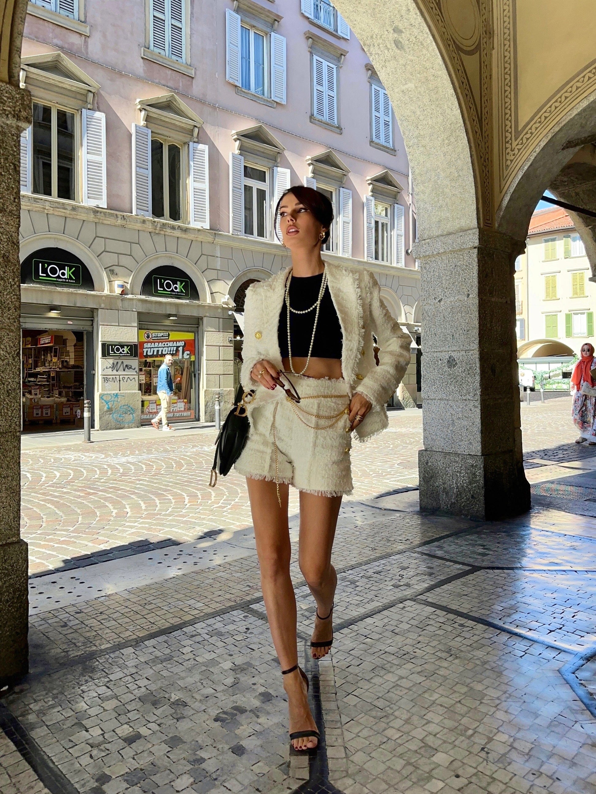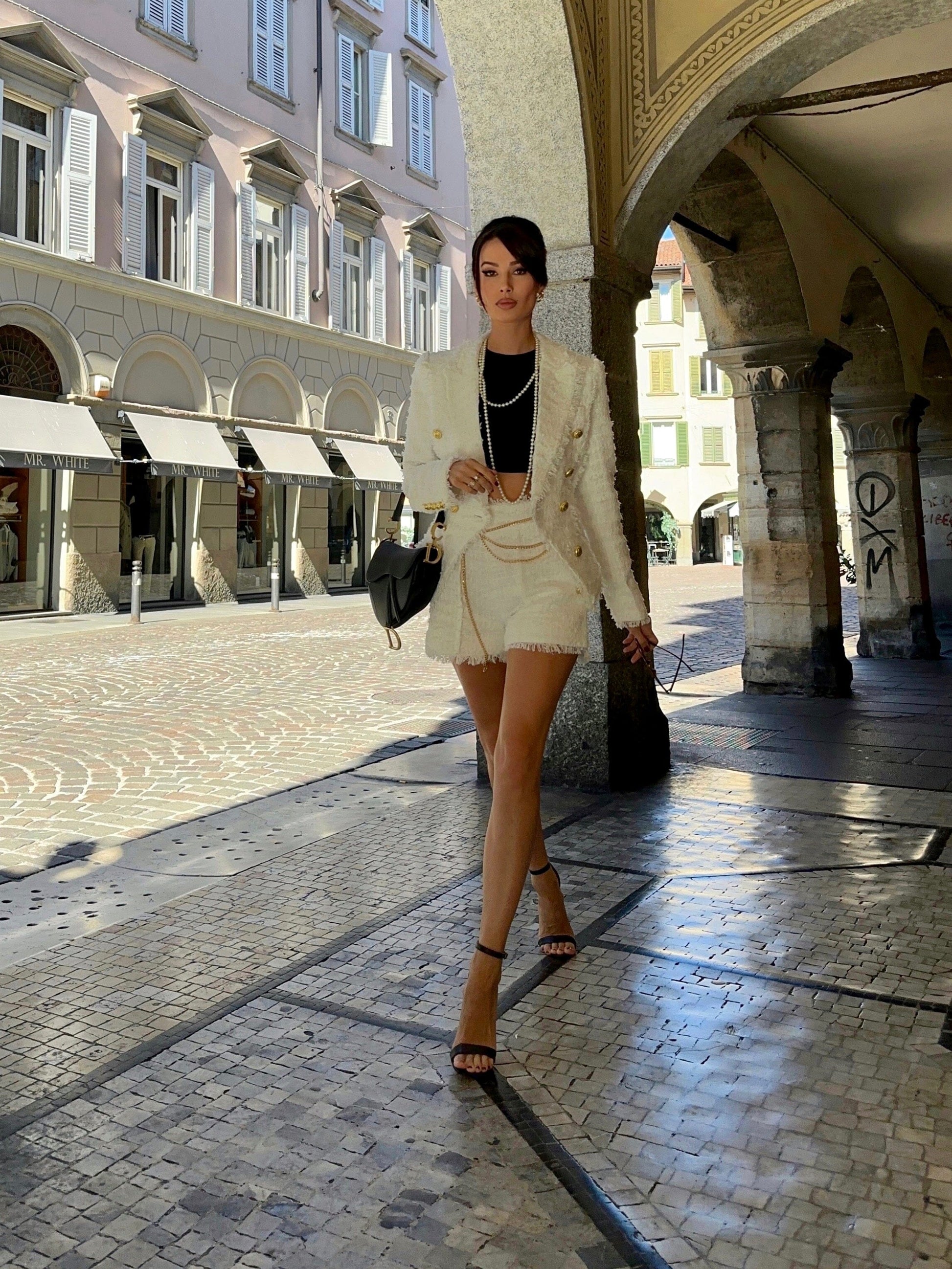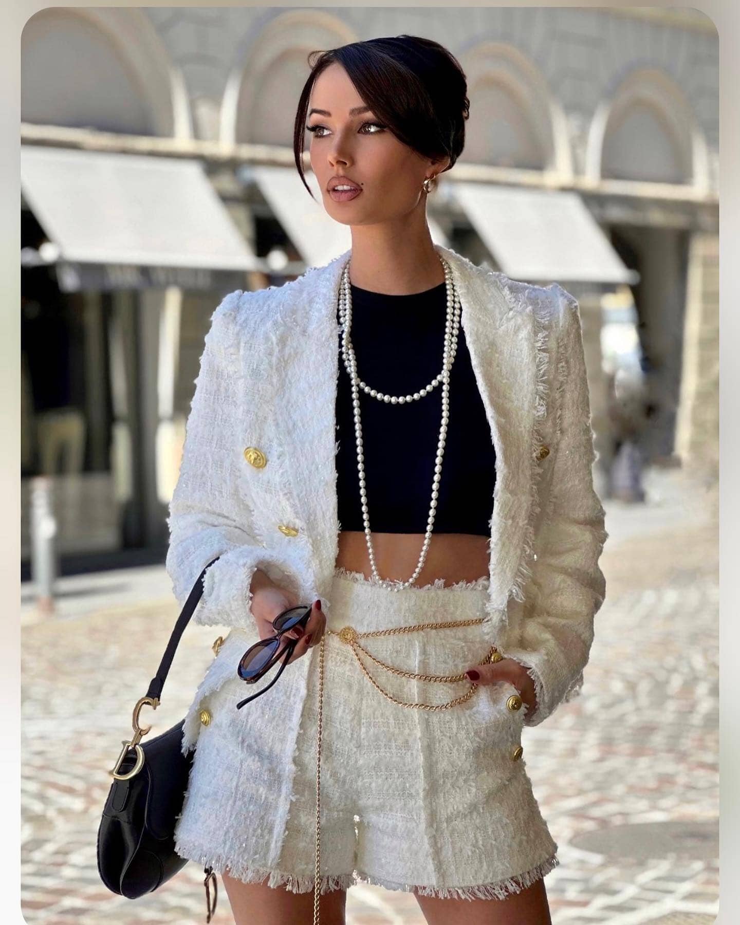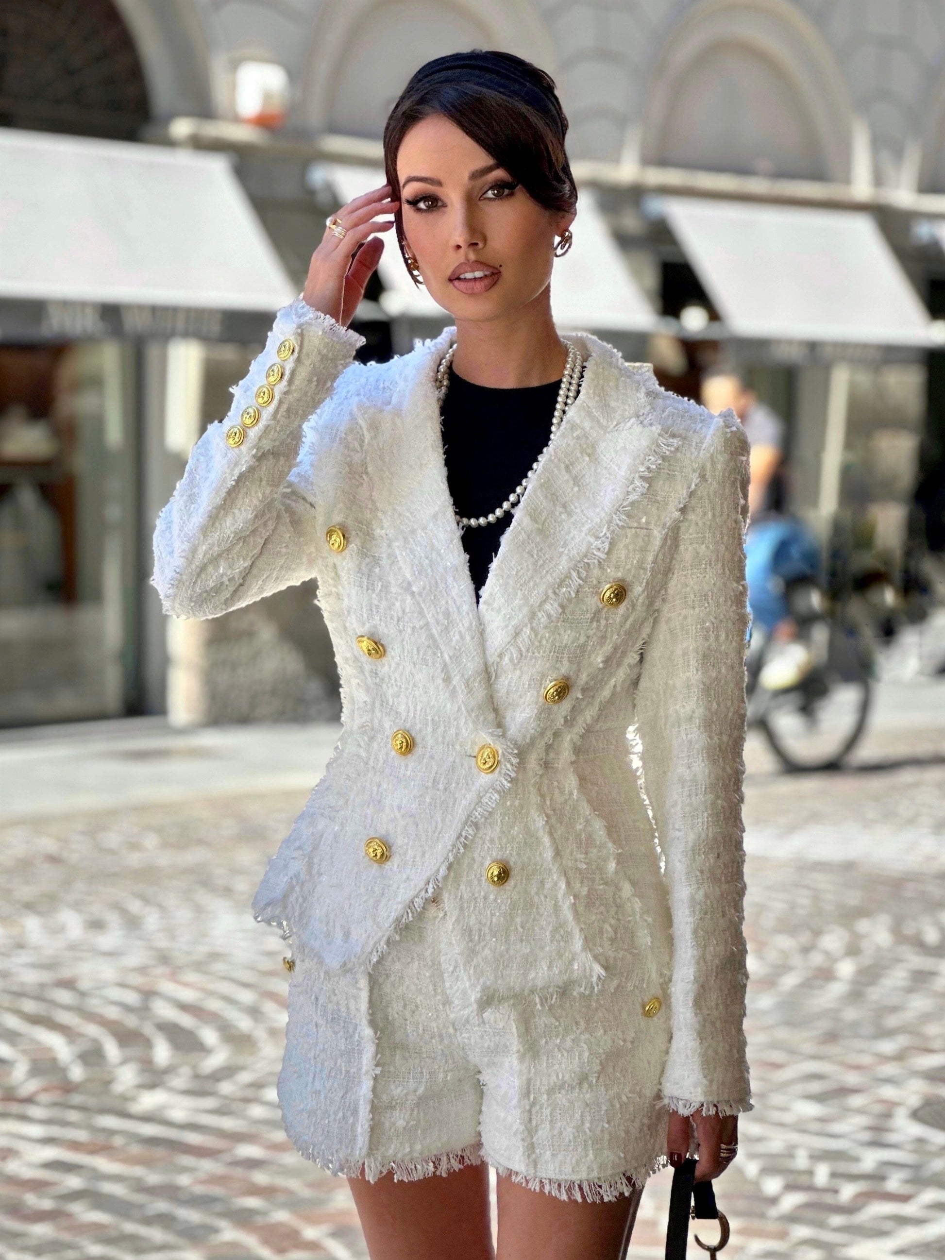 Stand out in style this season with the Siran Two Piece Set. Crafted from luxurious white tweed with timeless gold buttons, this set is a sophisticated choice for any event. Perfectly tailored for a structured fit, the blazer and matching shorts create a look of effortless elegance. Bring a touch of luxury to your wardrobe with this timeless two-piece set.