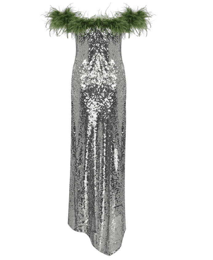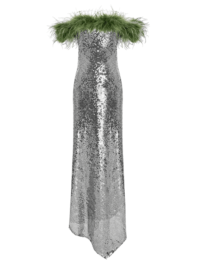 Introducing the Svetlana Maxi Dress: a statement piece with timeless glamour that will have you ready for any special occasion. Intricately adorned with shimmering silver sequins, this strapless design is elevated with luxe feather detail for a look that's sure to dazzle. Pair with classic metallic accessories for an unforgettable ensemble.