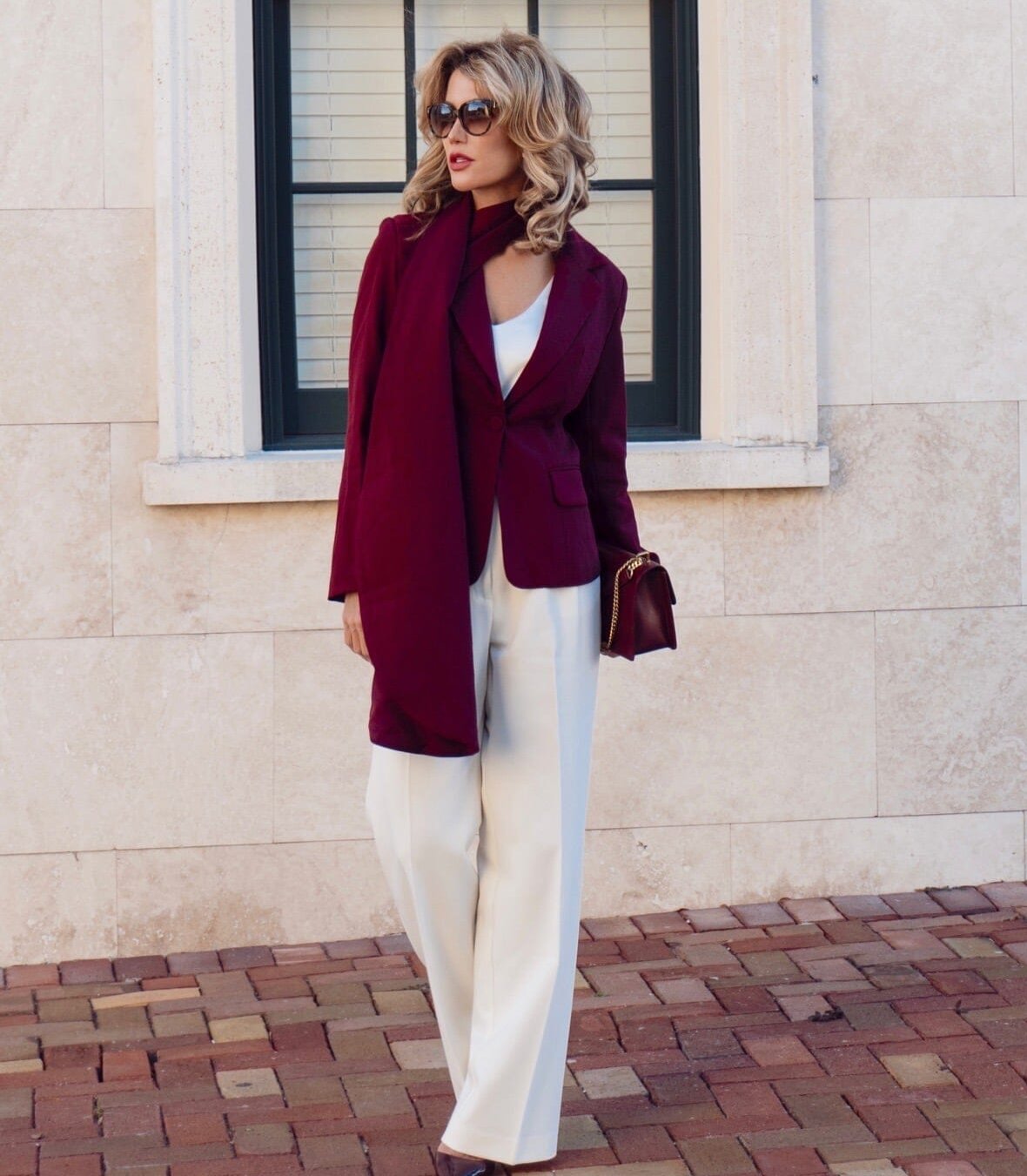 Indulge in the sophisticated style of the Tatsi Jacket. This luxurious burgundy blazer jacket is designed with a built-in scarf, elevating your look with an air of elegance and refinement. Perfect for the fashion-forward individual looking to make a statement.