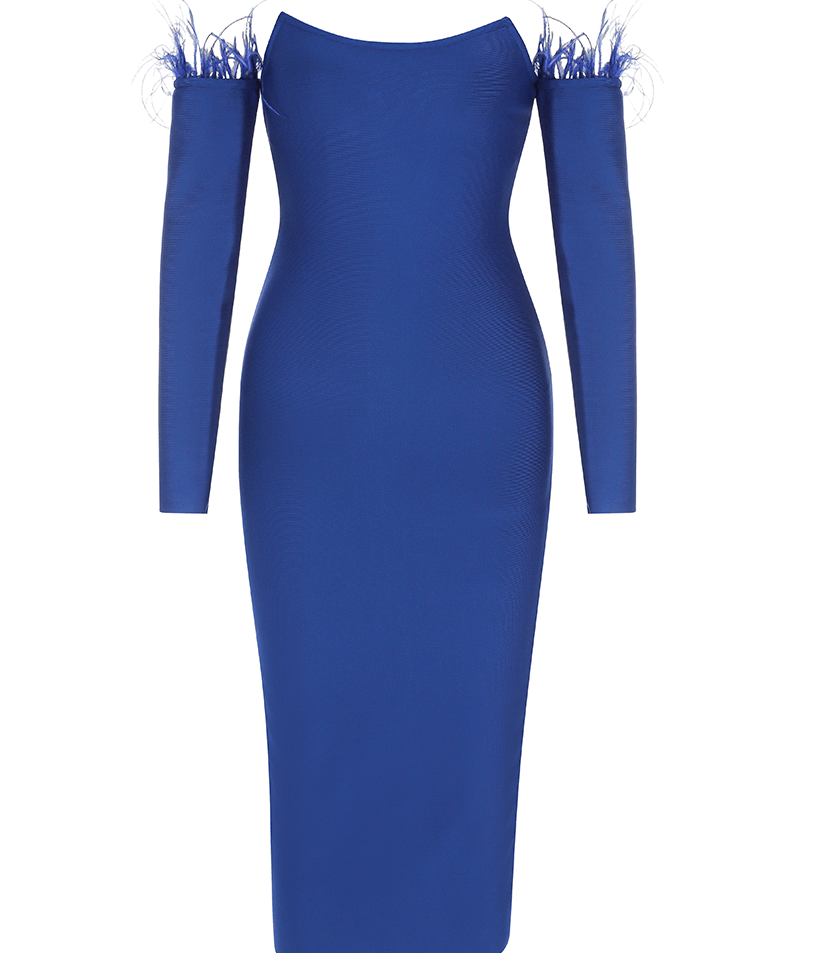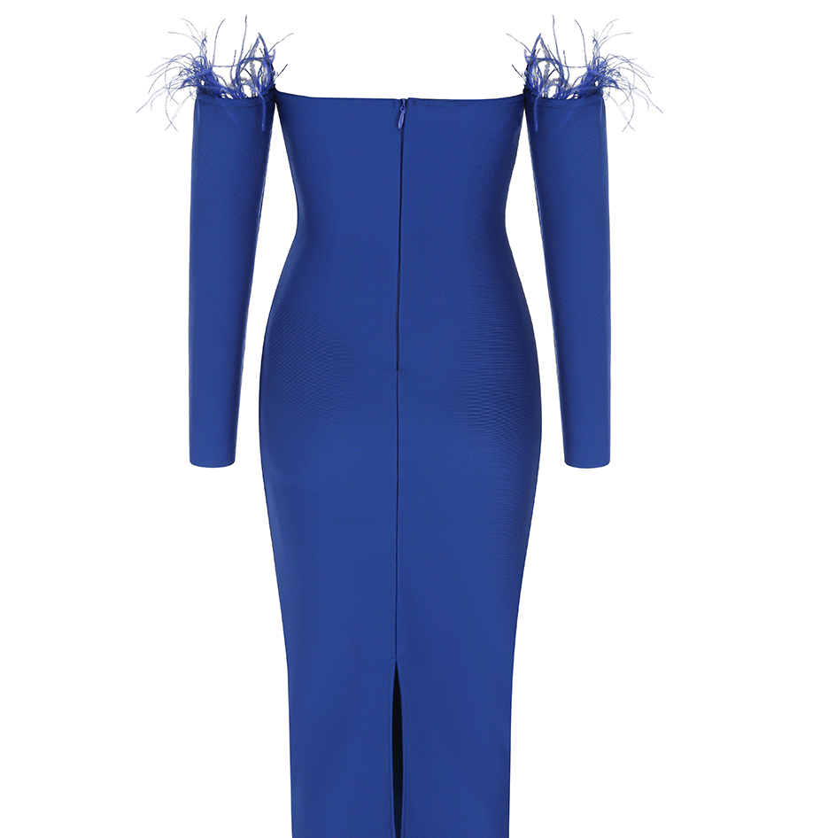 Get ready to stand out with our Valea midi dress! Featuring an off the shoulder design and a cinched waist in a bandage and feather material. Style with heels for a look we're obsessed with!