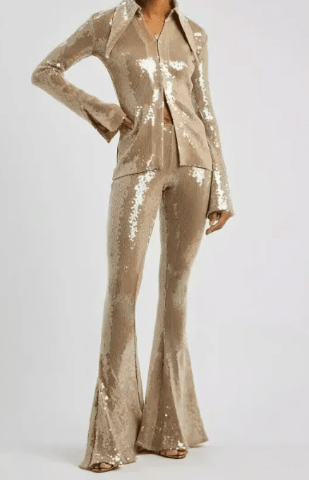For radiant evenings, look no further than this exquisite Wanya Two Piece Set. Crafted with luxurious gold sequin and bell bottom pants for a perfect fit, this ensemble exudes glamour and sophistication. Be ready to make a statement in this set, perfect for your special occasions.