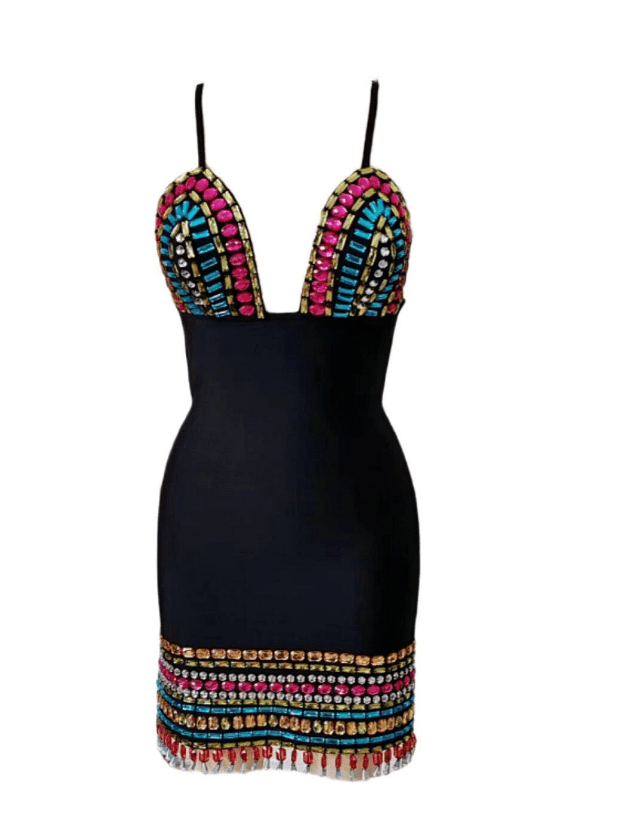 Indulge in luxury with our Zabi Mini Dress. This black mini dress is adorned with colorful rhinestone details, adding a touch of opulence to your wardrobe. Elevate your style and stand out in any crowd with this exclusive and sophisticated piece.