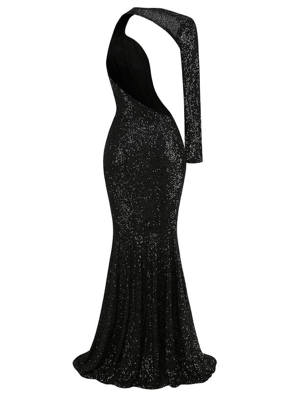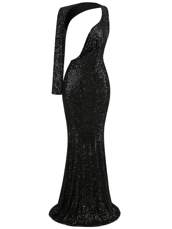 Elevate your style with the exquisite Zamira Maxi Dress. Glistening black sequins adorn this breathtaking, single sleeved dress, creating a mesmerizing and luxurious statement piece. Perfect for special occasions, it's sure to turn heads and make you feel like the ultimate fashion icon.
