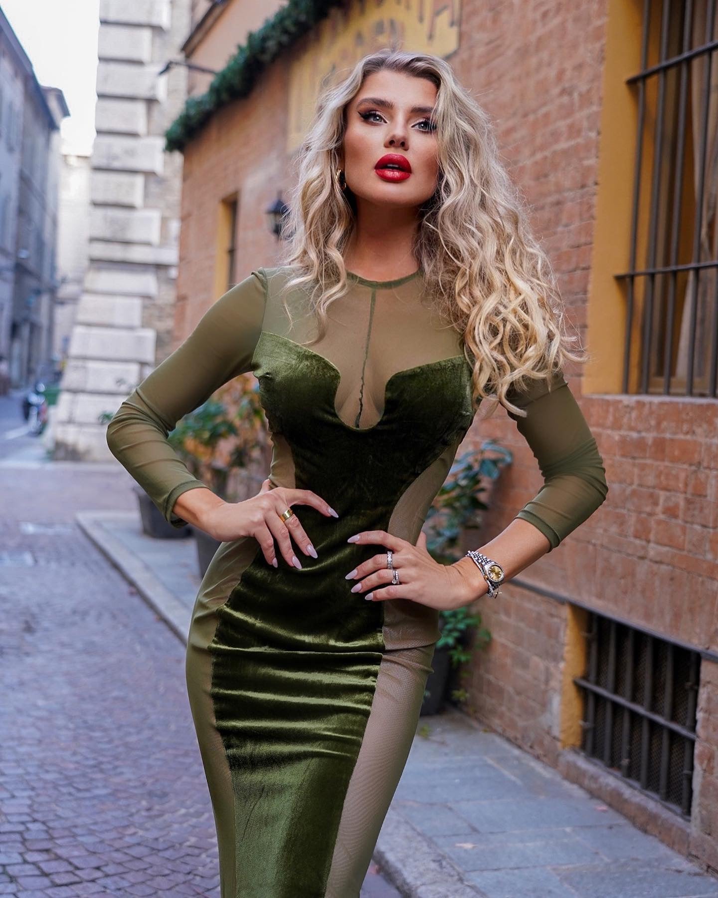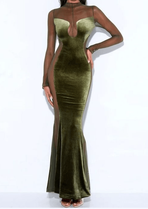 Our Zarife Dress has full sleeves and mesh detailing in a romantic full-length design. This dress is constructed from luxurious velvet. Style with heels for a chic look!